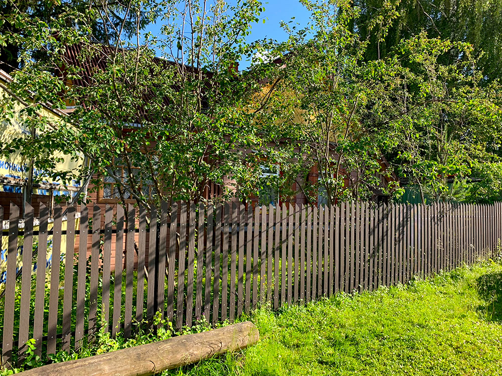 Для реализации этого проекта, нам понадобился специальный узкий полнотелый штакетник из ДПК. Ведь у владельца не так много времени посещать дачу и постоянно поддерживать деревянный штакетник в идеальной форме. Для ДПК-же такой уход не требуется и достаточно просто использовать по мере необходимости специальное средство для очистки ДПК и средство для защиты декинга. И он прослужит вам долгие годы не потребовав ничего дополнительно.
